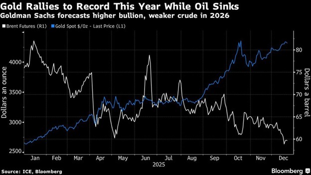به گزارش روابط عمومی گروه صنعتی معدنی زرمهر از اخبار بلومبرگ؛ افزایش بیسابقه قیمت طلا و ضعف مداوم قیمت نفت خام، دو ویژگی برجسته کالاهای جهانی در سال جاری بودهاند. گروه گلدمن ساکس معتقد است که هر دوی این روندها تا سال ۲۰۲۶ ادامه خواهند داشت.